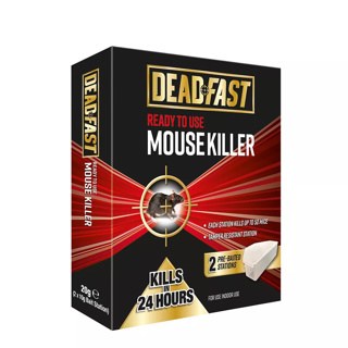 Deadfast Mouse Killer Pre-Baited Stations, Twin Pack - stations are pre- baited with the fast killing poison. Each station contains enough bait to kill up to 50 mice. Stations are deigned to be used indoors only and are tamper resistant for safe use around the home. Bait station will kill the mice even if they only consume a small amount of the bait. Pack contains 2 pre-baited stations.