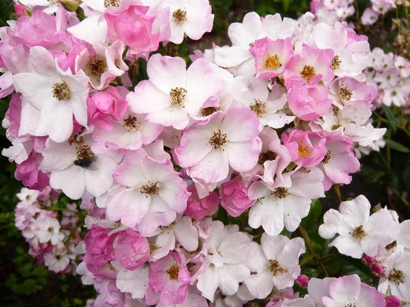 Masses of tiny single pale pink hydrangea like flowers white eye lasting all summer.Slightly fragrant. Ht 1m. Spread 90cm. Spray fortnightly with Roseclear when in leaf.Suitable for Border Hedge or Rose Bed. Dig in Organic Compost at Planting.